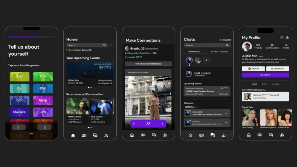 ConcertConnect allows users to connect with other concertgoers by providing a safe platform to make it easy for users to initiate conversation and inspire shared concert experiences.