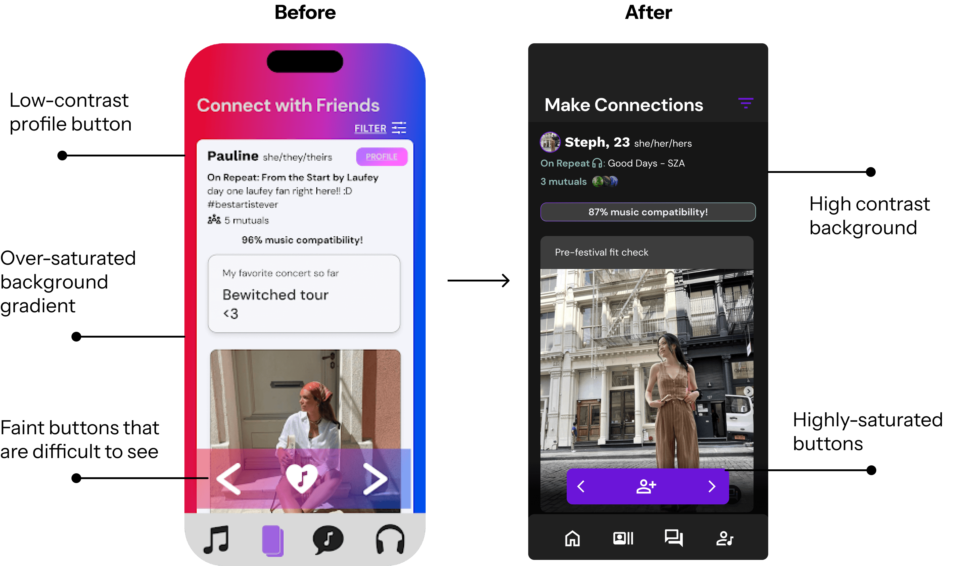 User testing revealed that the use of highly saturated gradients were distracting users. The visual clutter made navigating the main interface difficult and users were unable to find and use primary call-to-action elements on the page.