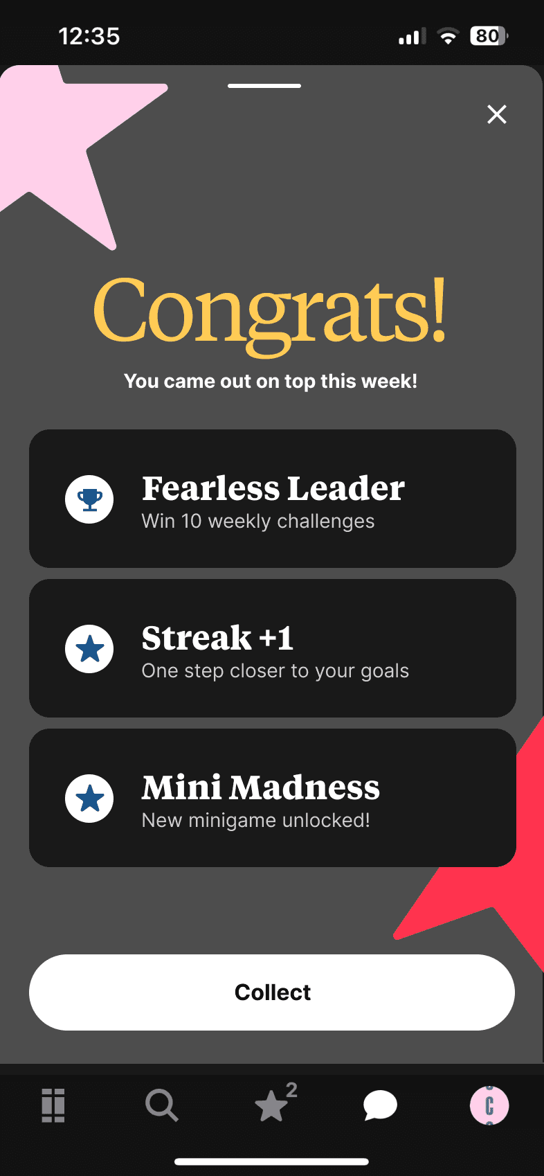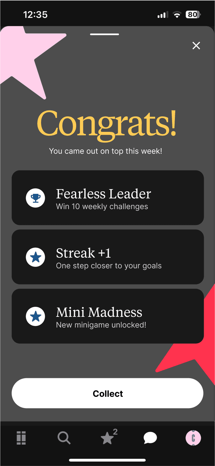 From my research, I determined that this feature would benefit from leaderboard-style challenges, where friends in the same group compete to complete and win prizes. Challenges have users interact with the app by having them read a certain number of articles or get 100% on a quiz. Scoring higher on the leaderboard is rewarded with prizes such as unlocked minigames.